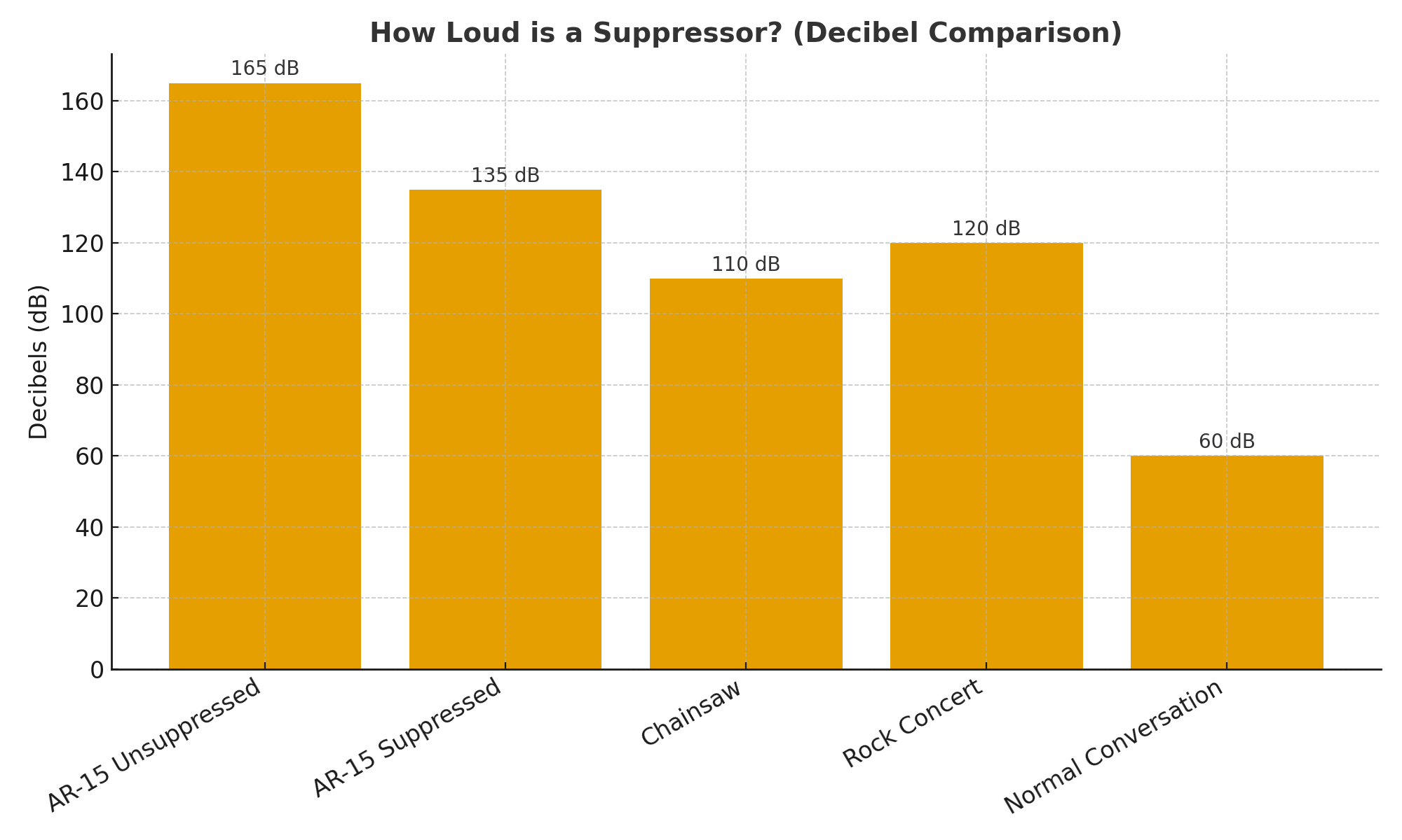 Noise Reduction: Most rifle suppressors reduce sound by 20–35 decibels. For context, a standard AR-15 in 5.56 NATO is around 165 dB at the muzzle—loud enough to cause permanent hearing damage after a single shot. With a suppressor, that drops closer to 130–140 dB. That’s still louder than a rock concert, but much safer for your ears.
